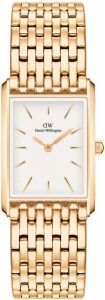 Женские наручные часы Bound 9-Link Gold. Стальной изогнутый прямоугольный корпус. Матовый циферблат украшен фирменным логотипом Daniel Wellington. Накладные метки в виде штрихов. Японский кварцевый механизм. Рифленая заводная головка. Стальной браслет с полированной отделкой. Раскладывающаяся застежка.