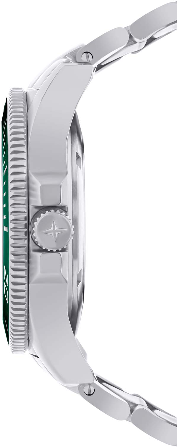 Завинчивающаяся рифленая заводная головка с защитой. Завинчивающаяся задняя крышка. Надежный стальной браслет с регулируемой застежкой позволяет легко носить часы поверх гидрокостюма.