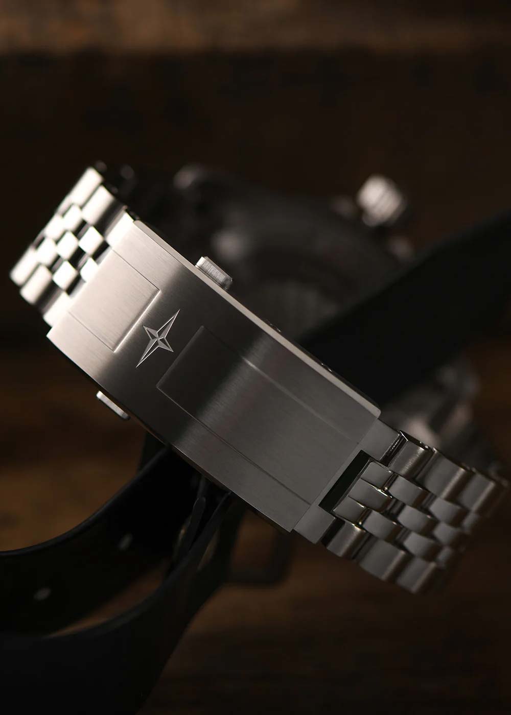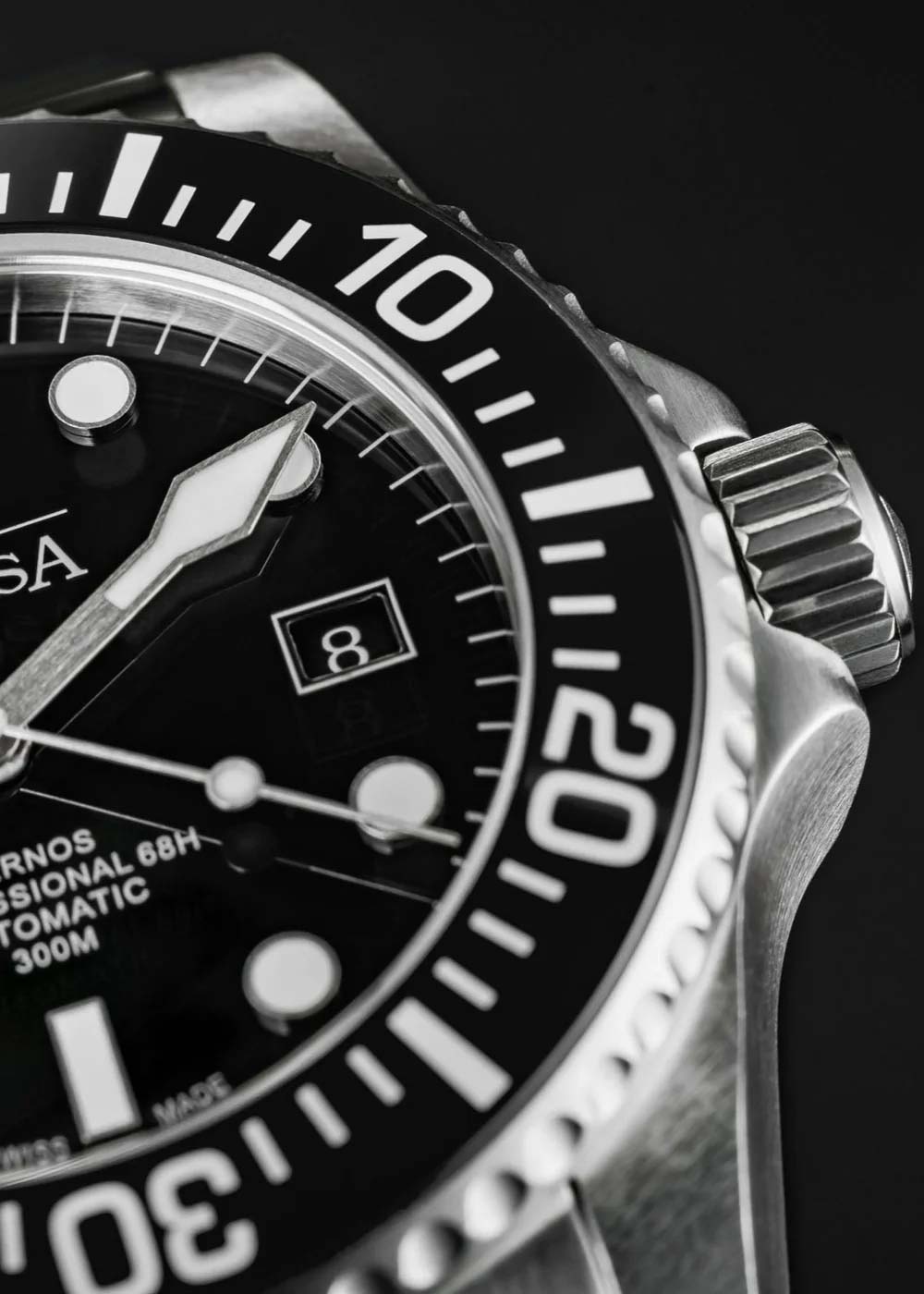 Окошко даты находится в положении 3 часа. Рифленый безель с керамической вставкой вращается в одном направлении. Завинчивающаяся рифленая заводная головка с защитой. Завинчивающаяся задняя крышка. Надежный стальной браслет с раскладывающейся застежкой, предохранительными кнопками и точной регулировкой WaveSlide.