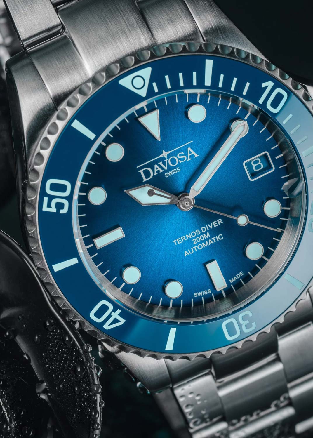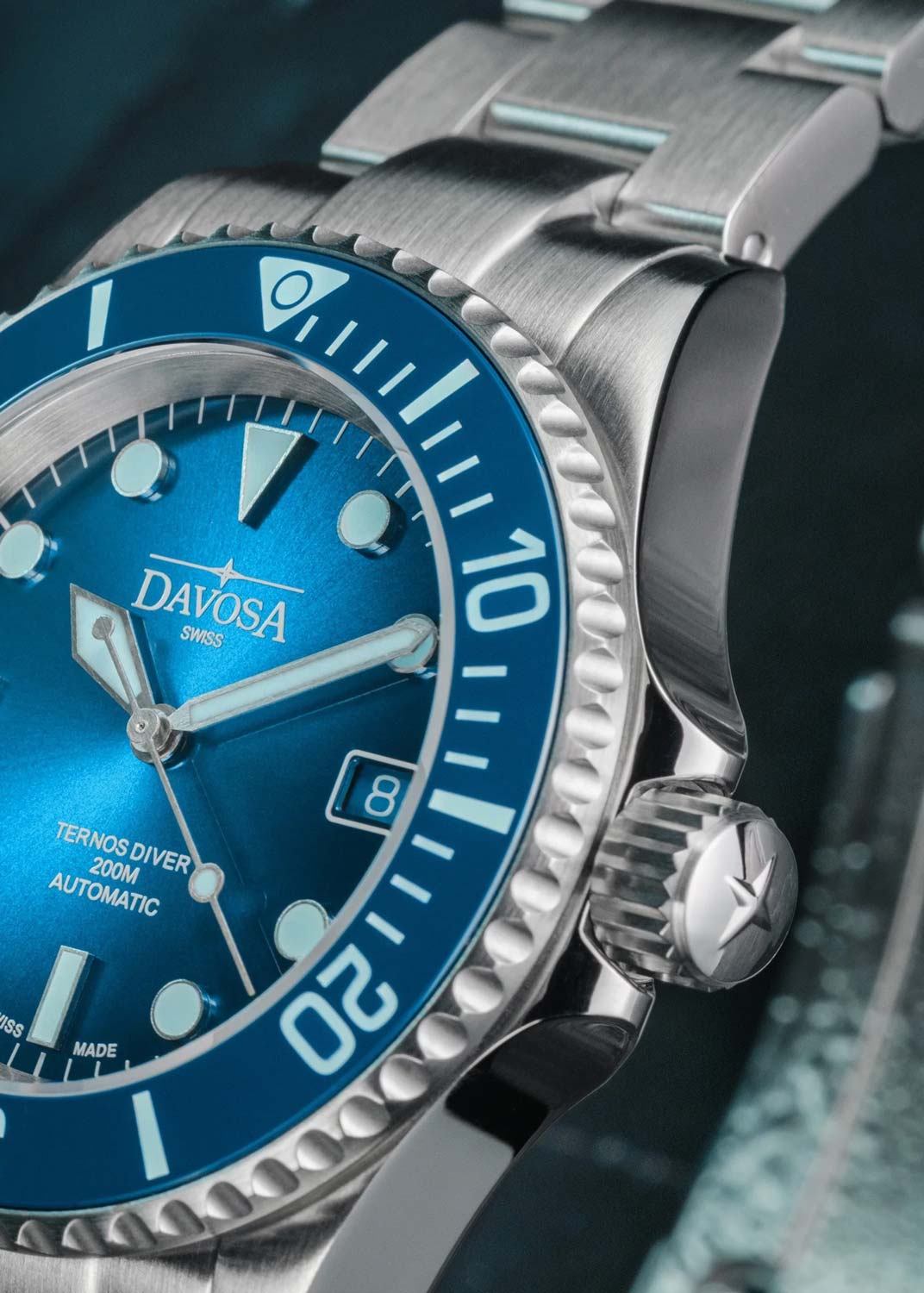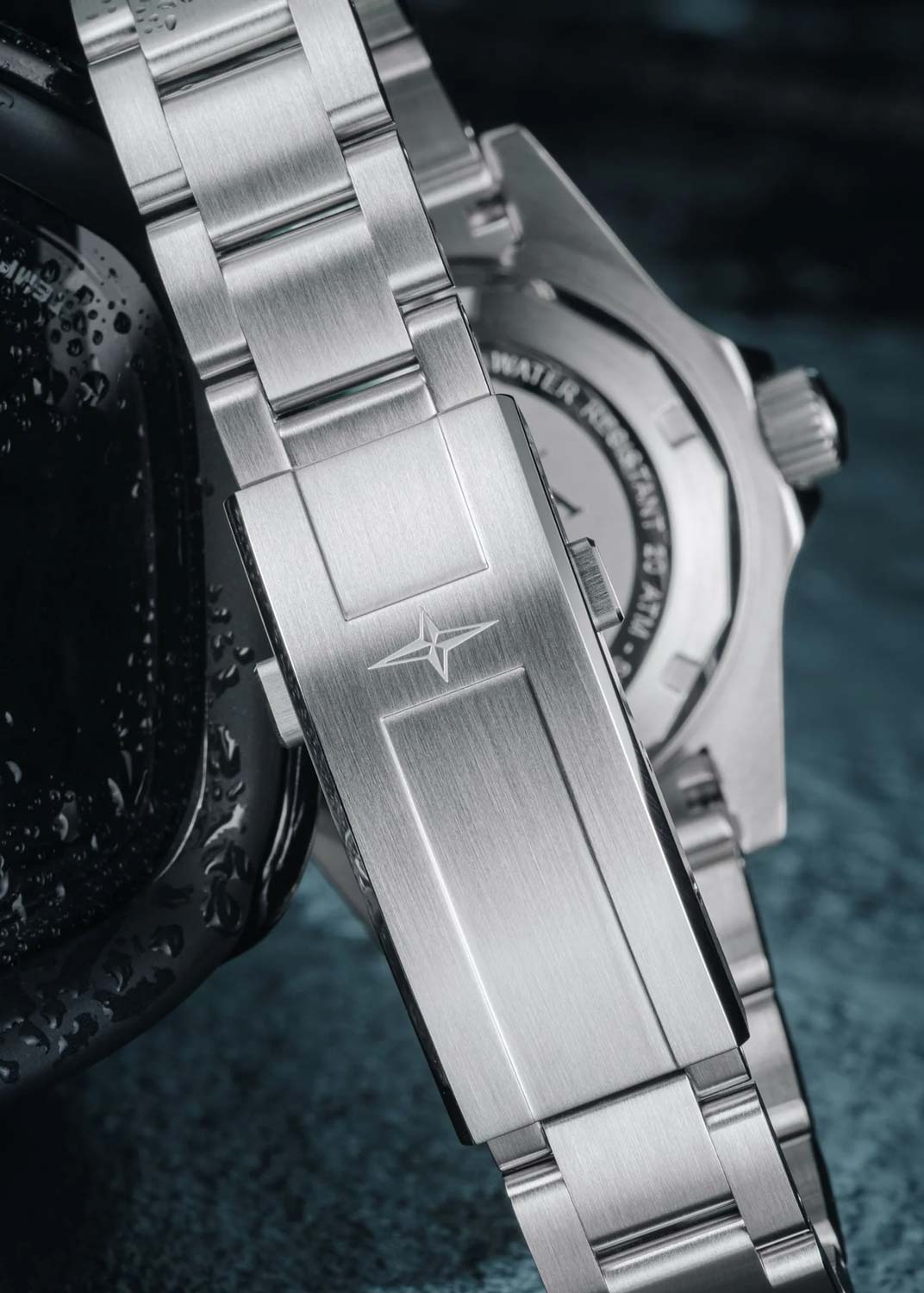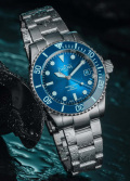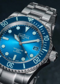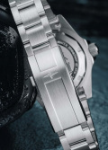 Окошко даты находится в положении 3 часа. Рифленый безель с керамической вставкой вращается в одном направлении. Завинчивающаяся рифленая заводная головка с защитой. Завинчивающаяся задняя крышка. Надежный стальной браслет с раскладывающейся застежкой, предохранительными кнопками и точной регулировкой WaveSlide.