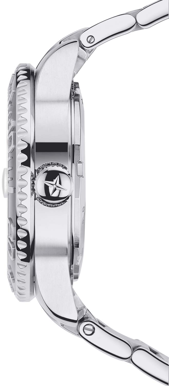 Завинчивающаяся рифленая заводная головка с защитой. Завинчивающаяся задняя крышка с гравировкой которая идентифицирует эти часы как особую модель и безошибочно отсылает к Калифорнии с ее пальмами, солнечными лучами и доской для серфинга. Надежный стальной браслет с регулируемой застежкой позволяет легко носить часы поверх гидрокостюма.