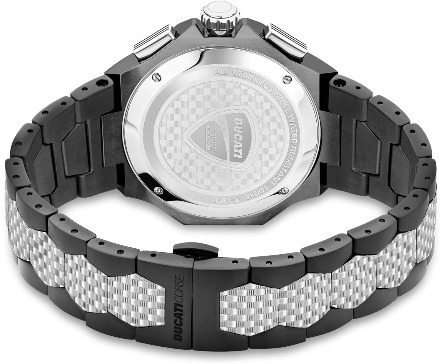 стеклом Hardlex. Эффектный безель дополнен стильными винтами и метками в виде арабских цифр 20, 40 и 60. Циферблат и задняя крышка украшены фирменным логотипом Ducati. Часовые метки в виде штрихов. Окошко даты находится между 4 и 5 часов. Рифленые широкие кнопки и заводная головка с защитой. Задняя крышка крепится на винтах. Прочный браслет из нержавеющей стали с раскладывающейся застежкой и выгравированными центральными звеньями под углеродное волокно.