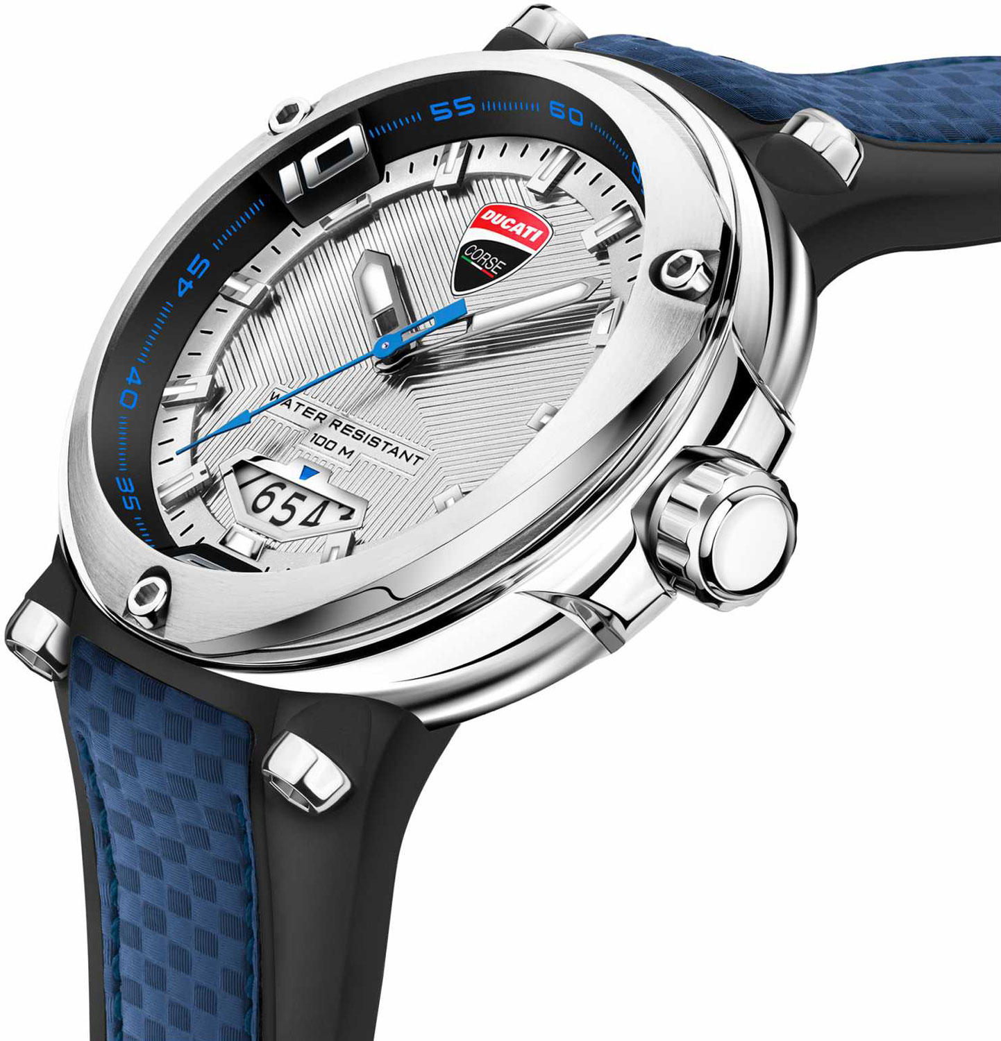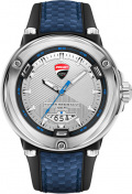 стеклом Hardlex. Эффектный безель в форме треугольника Рёло дополнен стильными винтами. Циферблат украшен декоративным узором и фирменным логотипом Ducati в положении 12 часов. Метки в виде штрихов. Окошко даты находится в положении 6 часов. Рифленая заводная головка с защитой. Задняя крышка крепится на винтах. Удобный силиконовый ремешок, покрытый натуральной итальянской кожей с карбоновым волокном, с классической застежкой. На застежке и задней крышке выгравирован фирменный логотип Ducati.