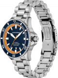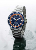 Завинчивающаяся задняя крышка украшена изображением водолазного шлема. Рифленая завинчивающаяся заводная головка с защитой. Надежный стальной браслет с раскладывающейся застежкой.
