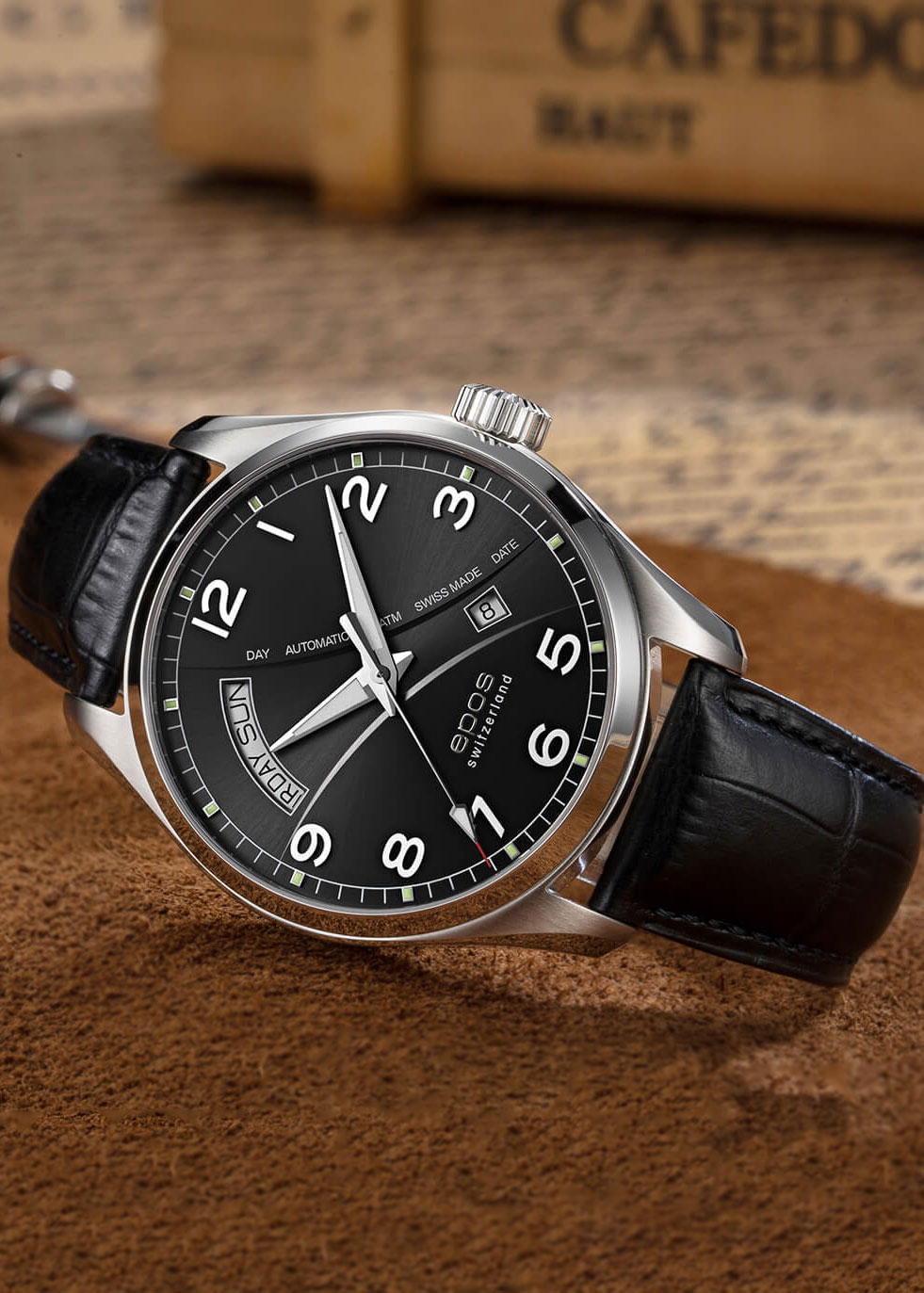 Окошко даты находится в положении 4 часа. Отображение полного названия дня недели в верхней части циферблата.