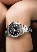 Рифленая заводная головка с защитой. Стальной браслет с раскладывающейся застежкой.
