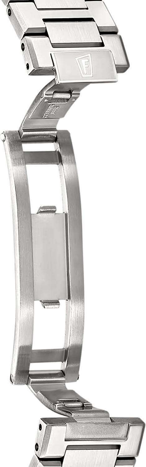 Рифленая заводная головка. Завинчивающаяся прозрачная задняя крышка. Стальной браслет с раскладывающейся застежкой.