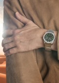 Рифленая заводная головка с защитой. Стальной браслет с раскладывающейся застежкой.