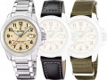 Стальной браслет с раскладывающейся застежкой. Дополнительно в комплект входят: черный ремешок из кожи теленка и ремешок из текстиля цвета хаки.