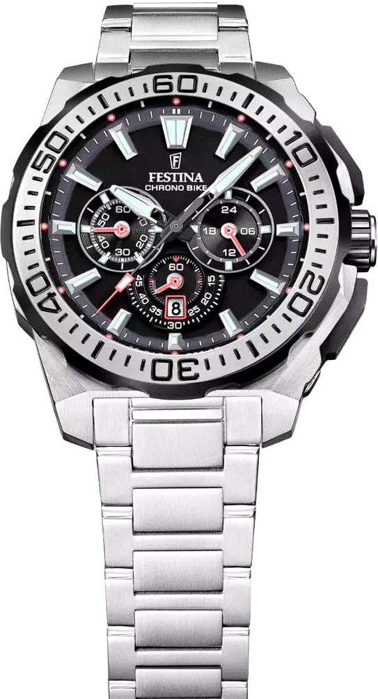 Циферблат выполнен по технологии Sunray (солнечные лучи) и украшен фирменным логотипом Festina Chrono Bike. Накладные метки в виде штрихов. Окошко даты находится в положении 6 часов.