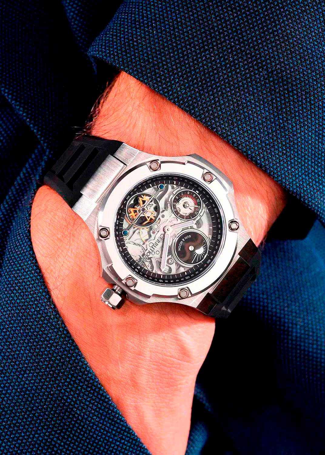 - мужские, швейцарские, кварцевые, 100WR, стекло: сапфировое, D 45,5мм, толщина 11,9мм, ширина браслета 22мм, вес 188г