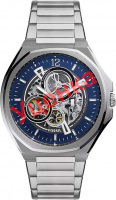 Скелетонизированные часы. Стальной корпус. Метки в виде штрихов и арабской цифры 12. Рифленая заводная головка с защитой. Браслет с раскладывающейся застежкой.