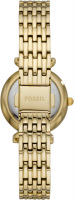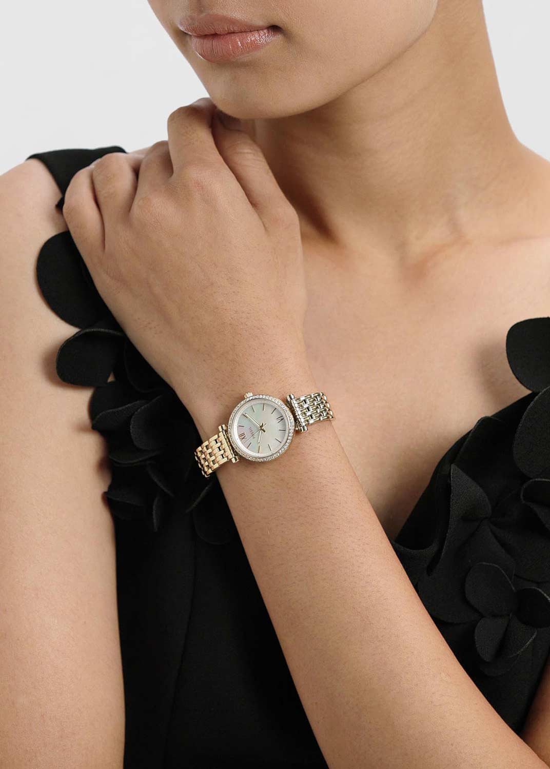 инкрустирован кристаллами. Перламутровый циферблат с метками в виде штрихов и римских цифр VI и XII. Заостренные прямоугольные стрелки в стиле Baton с люминесцентным