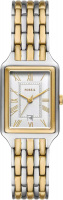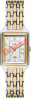 Женские наручные часы. Прямоугольный стальной корпус. Метки в виде римских цифр. Окошко даты находится в положении 6 часов. Рифленая заводная головка. Браслет с раскладывающейся застежкой.