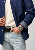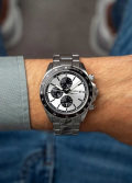 Окошко даты находится в положении 3 часа. Указатель дня недели вынесен на отдельный циферблат в положении 9 часов. Метки и стрелки с люминесцентным покрытием, которое светится в темноте после непродолжительной зарядки на свету. Рифленая заводная головка с защитой. Браслет с раскладывающейся застежкой.