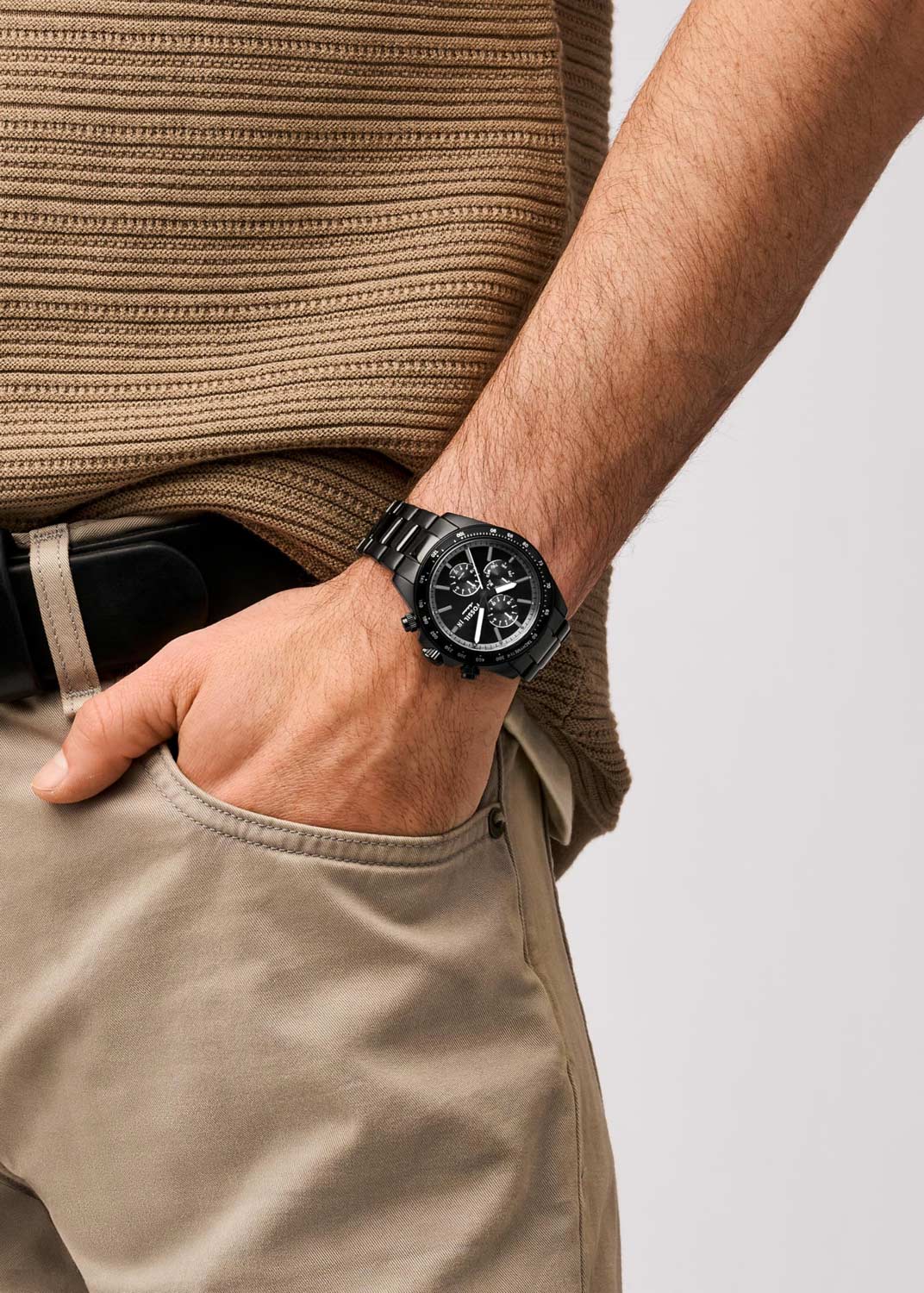 Метки и стрелки с люминесцентным покрытием, которое светится в темноте после непродолжительной зарядки на свету. Рифленая заводная головка с защитой. Браслет с раскладывающейся застежкой.