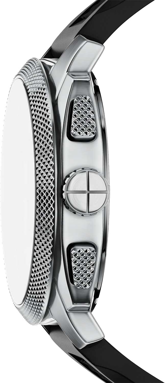 Рифленая заводная головка. Силиконовый ремешок с классической застежкой и системой быстрой замены. В комплекте браслет.