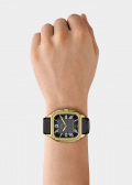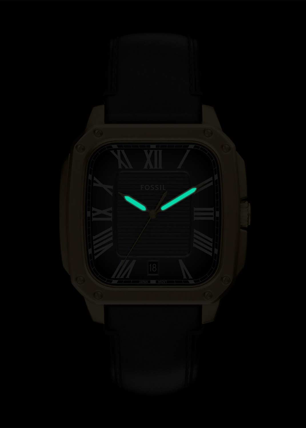 Стрелки с люминесцентным покрытием, которое светится в темноте после непродолжительной зарядки на свету. Рифленая заводная головка с защитой. Кожаный ремешок с классической застежкой.