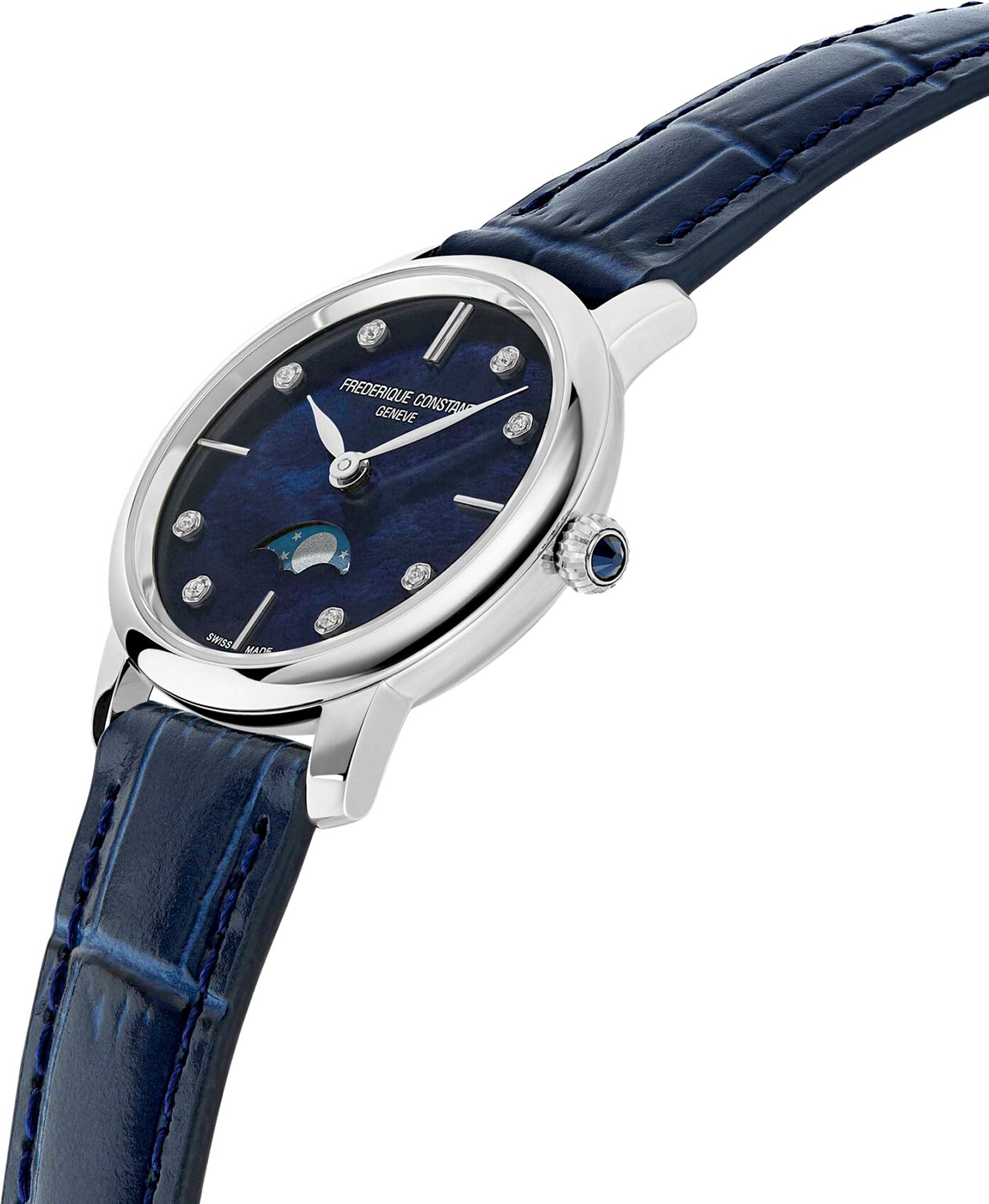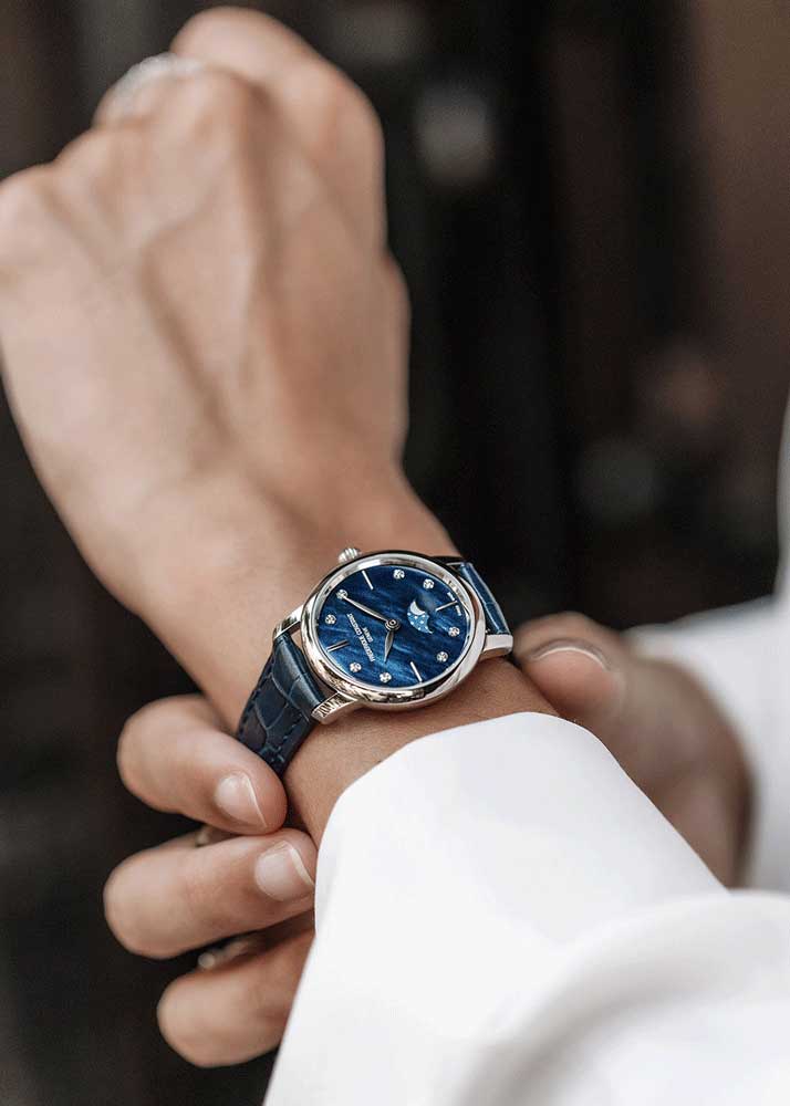 Метки в виде штрихов и точек, украшенных бриллиантами. Листовидные полированные стрелки в стиле Feuille. Индикатор фаз Луны находится в положении 6 часов. Сапфировое антибликовое с двух сторон стекло.
