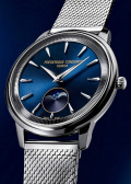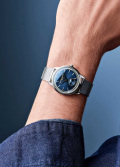 Накладные метки в виде штрихов. Стальные отполированные клиновидные стрелки в стиле Dauphine. Индикатор фаз Луны находится в положении 6 часов. Сапфировое антибликовое с двух сторон стекло.Рифленая заводная головка. Стальная задняя крышка. Стальной браслет миланского плетения с раскладывающейся застежкой и системой быстрой замены.