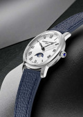 Рифленая заводная головка в форме луковицы, украшена камнем в форме кабошона. Завинчивающаяся стальная задняя крышка. Удобный ремешок из натуральной кожи. Раскладывающаяся застежка и система быстрой замены ремешка.