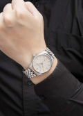 Стрелки и метки с люминесцентным покрытием, которое светится в темноте после непродолжительной подзарядки на свету. Рифленая заводная головка. Завинчивающаяся задняя крышка. Браслет с раскладывающейся застежкой.