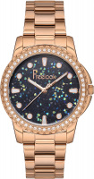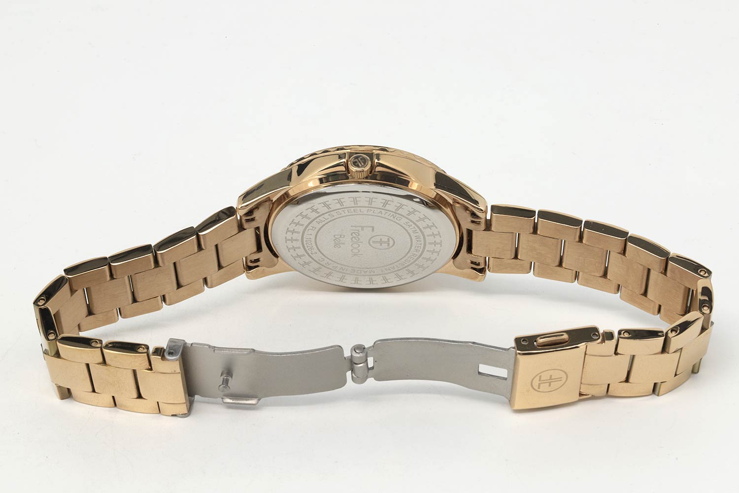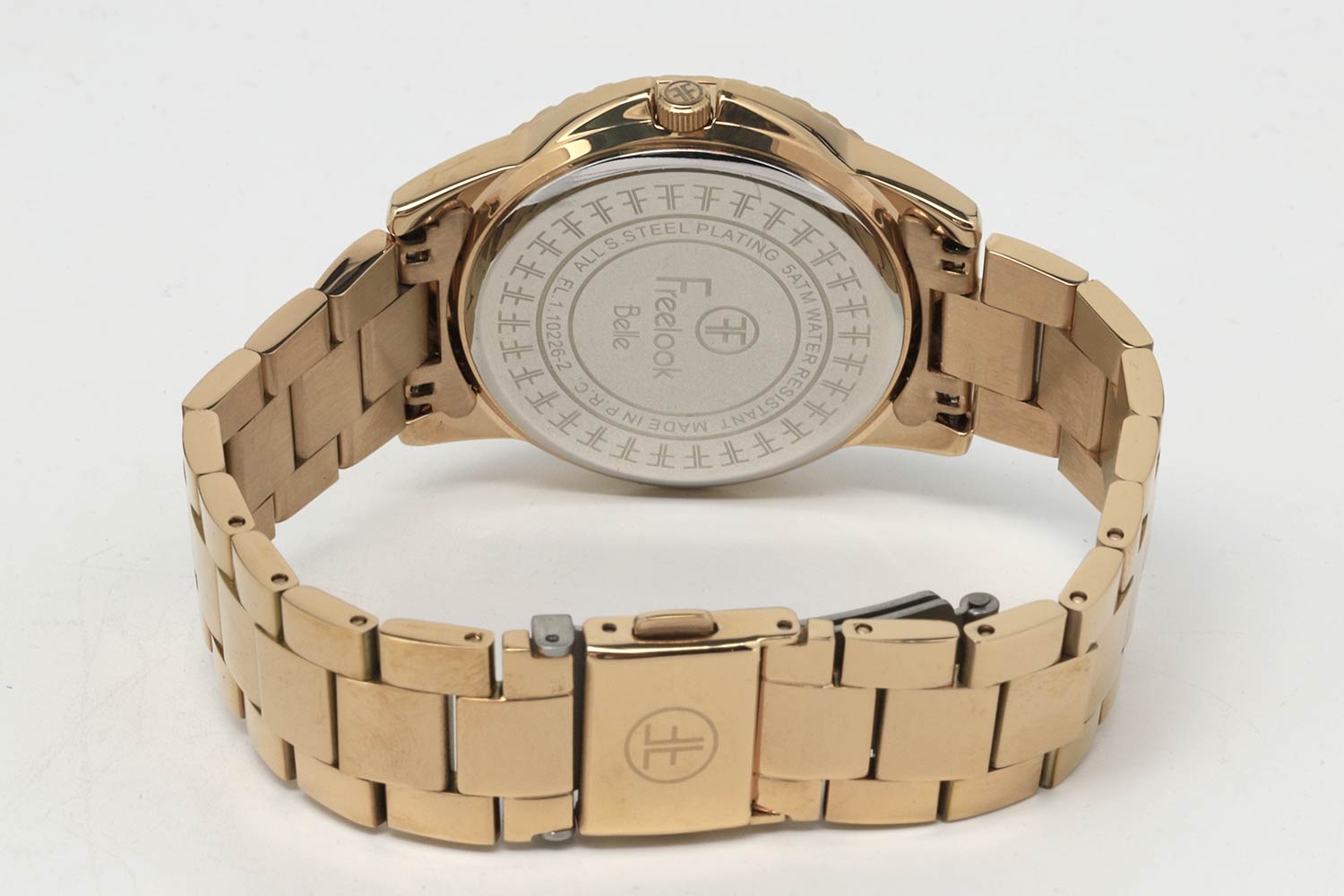 покрытием, которое светится в темноте после непродолжительной зарядки на свету. Метки в виде точек и штрихов. Рифленая заводная головка с защитой. Стальной браслет с раскладывающейся застежкой. Секундная стрелка, циферблат, заводная головка и застежка украшены фирменным логотипом Freelook.