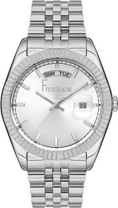 покрытием, которое светится в темноте после непродолжительной зарядки на свету. Завинчивающаяся задняя крышка. Надежный стальной браслет с раскладывающейся застежкой. Секундная стрелка, циферблат, рифленая заводная головка и застежка украшены фирменным логотипом Freelook.