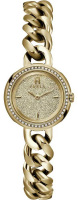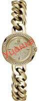 Модные женские часы. Корпус украшен кристаллами. Метки в виде штрихов с фирменной аркой в положении 12 часов. Закругленные стрелки. Рифленая заводная головка с фирменным логотипом. Стальной браслет с ювелирной застежкой выполнен в виде цепочки.