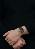 Прямоугольные стрелки в стиле Baton с люминесцентным покрытием, которое светится в темноте после непродолжительной зарядки на свету. Окошко даты с увеличительным стеклом находится в положении 3 часа. Рифленая заводная головка. Завинчивающаяся задняя крышка. Стальной браслет с раскладывающейся застежкой.