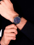 Накладные метки в виде штрихов. Заостренные прямоугольные стрелки в стиле Baton. Окошко даты находится в положении 3 часа. Рифленая заводная головка. Удобный кожаный ремешок.