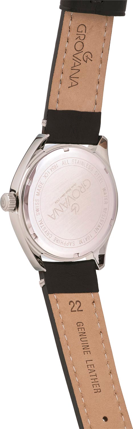 Ремешок в часах Grovana Airborne выполнен из натуральной кожи коричневого или черного цветов и украшен контрастной светлой прострочкой. Это не просто эстетическая деталь — такой дизайн напрямую отсылает к историческим авиационным часам времён Второй мировой войны.