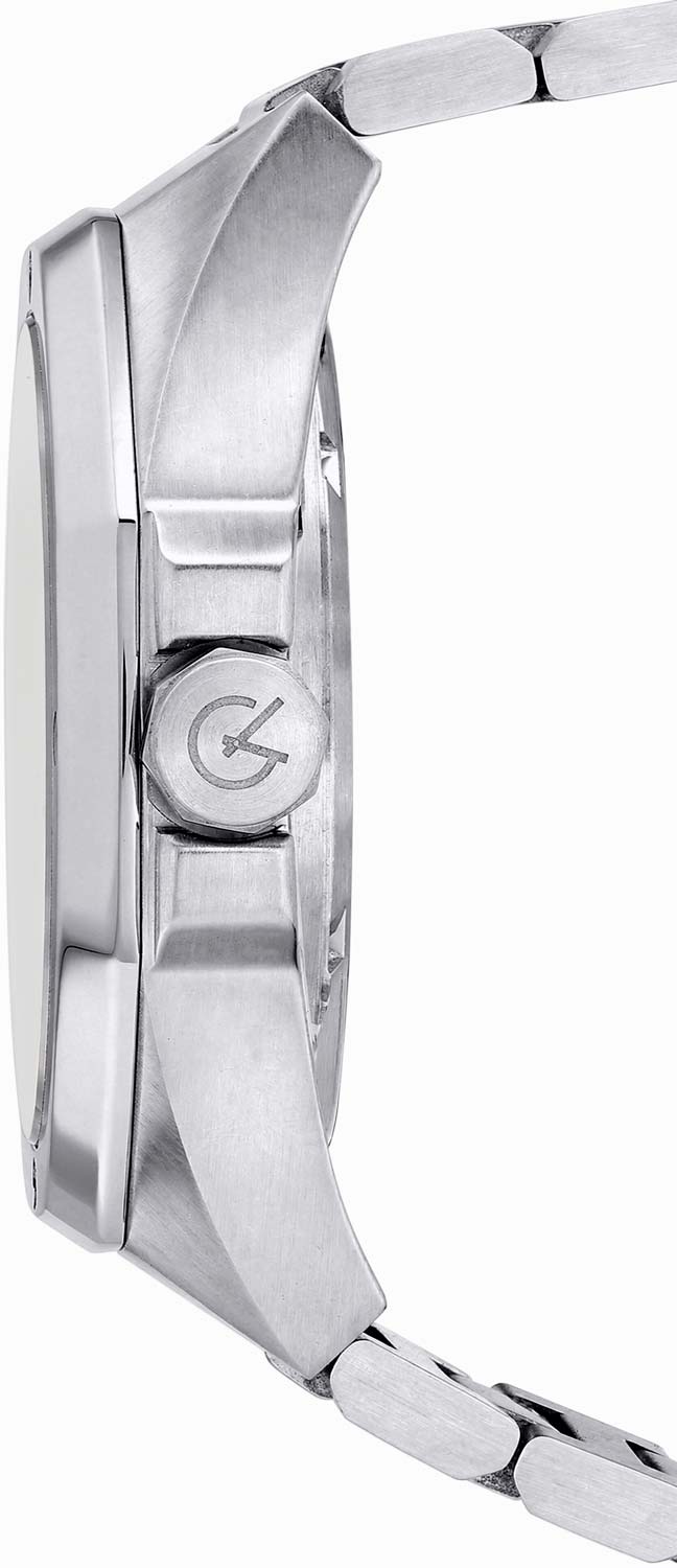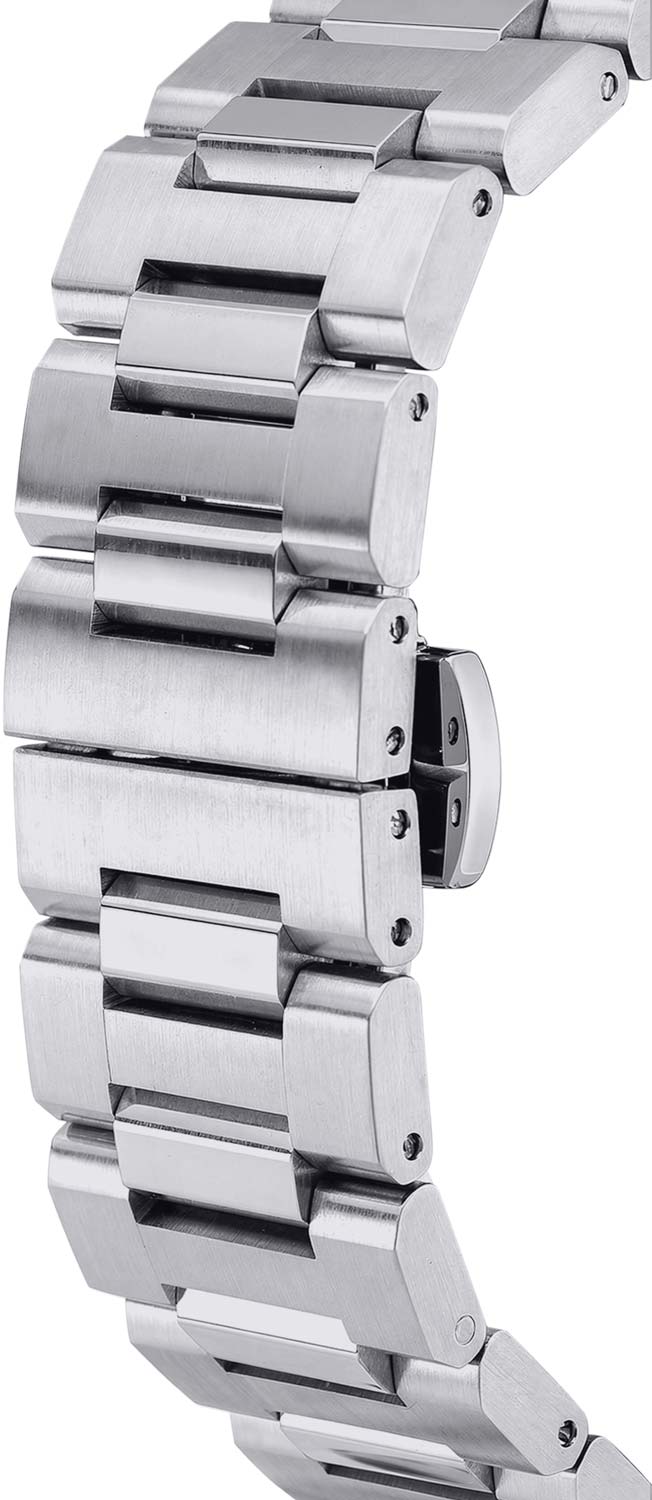 Стрелки и метки с люминесцентным покрытием, которое светится в темноте после непродолжительной зарядки на свету. Заводная головка в форме болта с защитой. Стальной браслет с раскладывающейся застежкой.