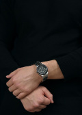 Заостренные прямоугольные стрелки в стиле Baton. Стрелки и метки с люминесцентным покрытием, которое светится в темноте после непродолжительной зарядки на свету. Окошко даты находится между часовыми метками 4 и 5.