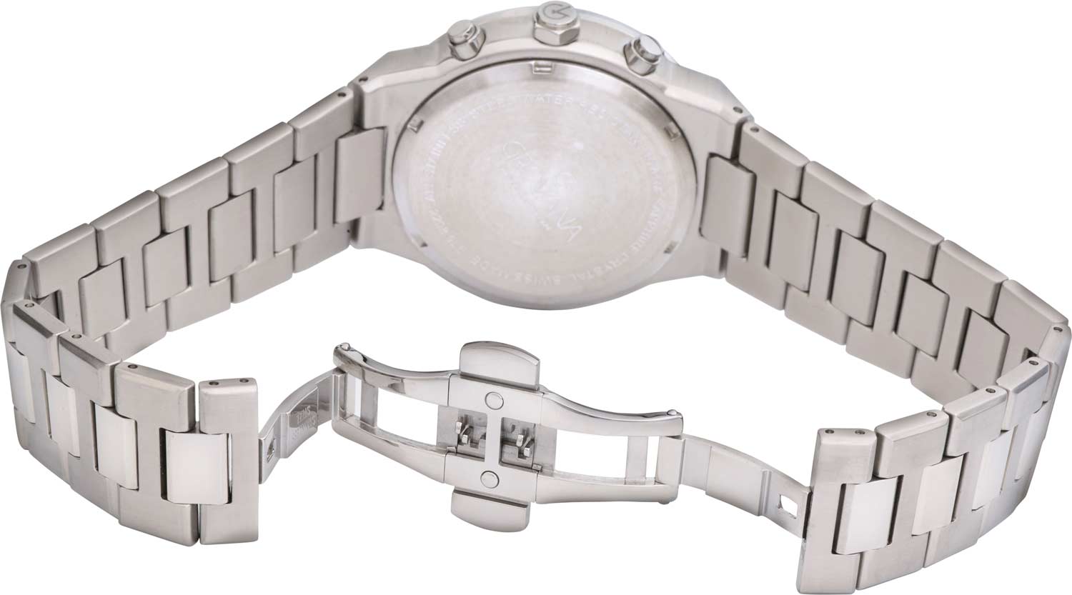 Шестигранная заводная головка. Завинчивающаяся задняя крышка. Стальной браслет с раскладывающейся застежкой.