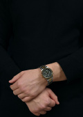 Шестигранная заводная головка. Завинчивающаяся задняя крышка. Стальной браслет с раскладывающейся застежкой.