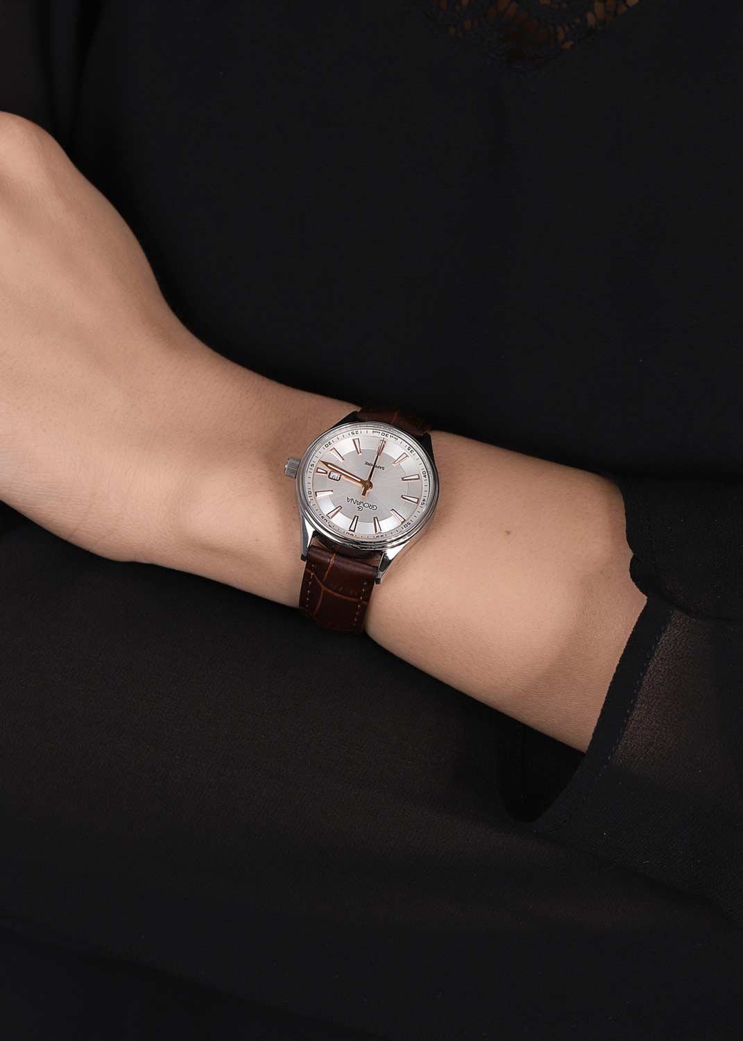 Метки и стрелки с люминесцентным покрытием, которое светится в темноте после непродолжительной зарядки на свету. Окошко даты находится в положении 3 часа. Рифленая заводная головка. Удобный кожаный ремешок с классической застежкой.