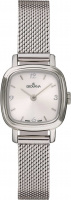Накладные метки в виде штрихов и арабских цифр. Заостренные прямоугольные стрелки в стиле Baton. Плоская рифленая заводная головка. Браслет миланского плетения.