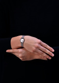 Накладные метки в виде штрихов и арабских цифр. Заостренные прямоугольные стрелки в стиле Baton. Плоская рифленая заводная головка. Браслет миланского плетения.