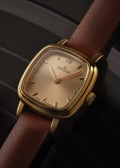 Накладные метки в виде штрихов и арабских цифр. Заостренные прямоугольные стрелки в стиле Baton. Плоская рифленая заводная головка. Удобный кожаный ремешок с классической застежкой.