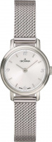 Накладные метки в виде штрихов и арабских цифр. Заостренные прямоугольные стрелки в стиле Baton. Плоская рифленая заводная головка. Браслет миланского плетения.