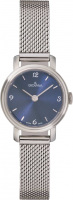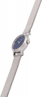 Накладные метки в виде штрихов и арабских цифр. Заостренные прямоугольные стрелки в стиле Baton. Плоская рифленая заводная головка. Браслет миланского плетения.