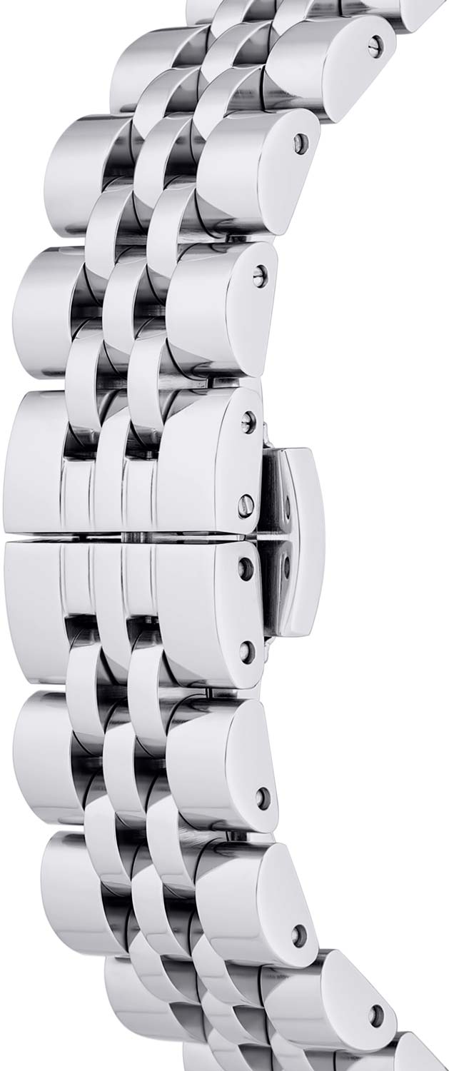 Прямоугольные стрелки в стиле Baton с люминесцентным покрытием, которое светится в темноте после непродолжительной зарядки на свету. Окошко даты с увеличительным стеклом находится в положении 3 часа. Рифленая заводная головка. Завинчивающаяся задняя крышка. Стальной браслет с раскладывающейся застежкой.