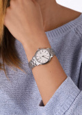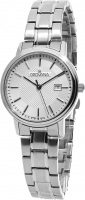 Метки в виде штрихов. Окошко даты находится в положении 3 часа. Рифленая заводная головка. Стальной браслет с раскладывающейся застежкой.