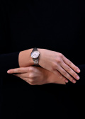 Метки в виде арабских цифр. Окошко даты находится в положении 3 часа. Рифленая заводная головка. Стальной браслет с раскладывающейся застежкой.