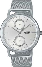 Часы с круглым стальным корпусом Mist. 12-ти и 24-х часовой формат времени. Гильошированный циферблат выполнен по технологии Sunray (солнечные лучи). Метки в виде штрихов. Время в 24-х часовом формате, число и день недели вынесены на отдельные циферблаты. Рифленая заводная головка с защитой. Браслет с раскладывающейся застежкой.