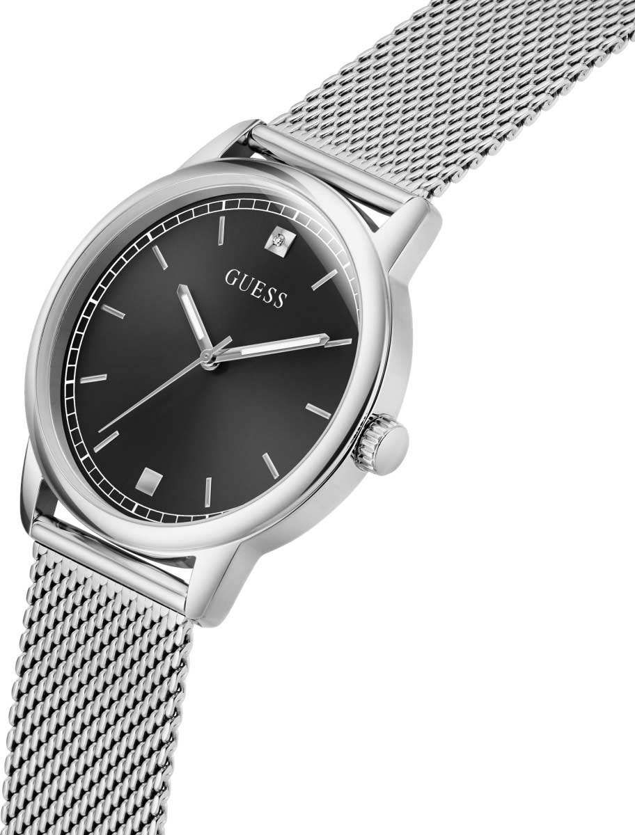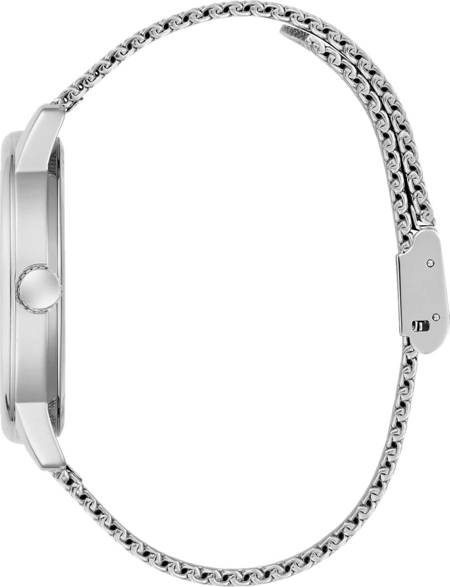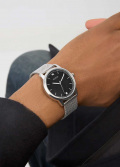 Заостренные прямоугольные стрелки в стиле Baton с люминесцентным покрытием, которое светится в темноте. Рифленая заводная головка. Браслет миланского плетения.
