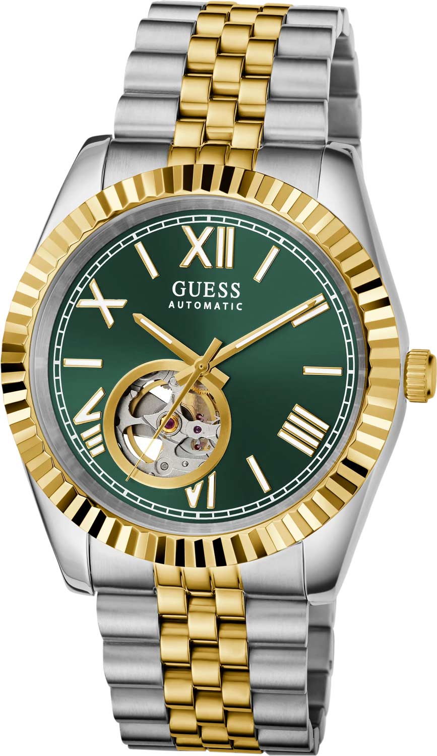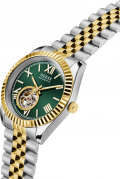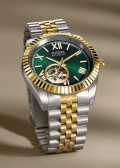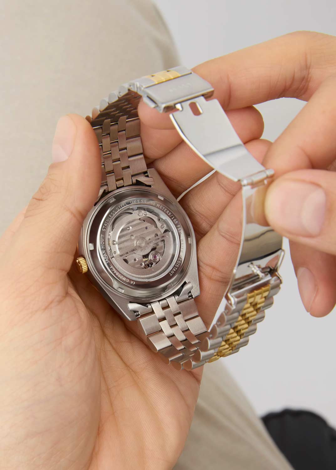 Сквозь прозрачные окошки на циферблате можно наблюдать работу механизма часов. Стрелки и метки с люминесцентным покрытием, которое светится в темноте. Рифленая заводная головка. Завинчивающаяся прозрачная задняя крышка. Браслет с раскладывающейся застежкой.
