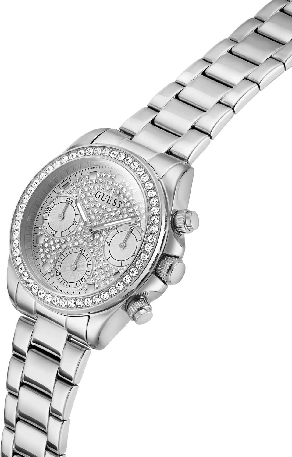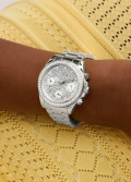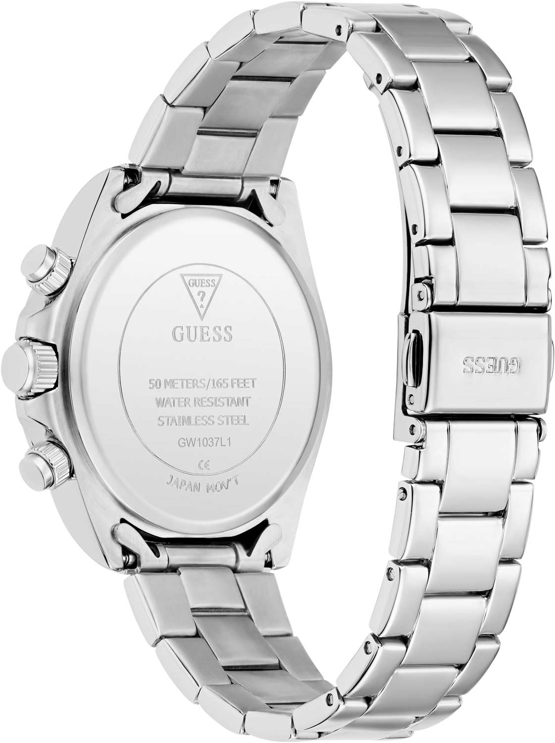 Время в 24-х часовом формате, дата и день недели вынесены на отдельные циферблаты. Рифленая заводная головка с защитой. Браслет с раскладывающейся застежкой.