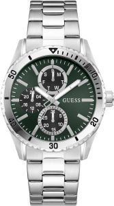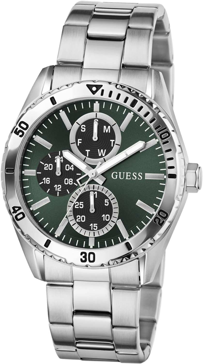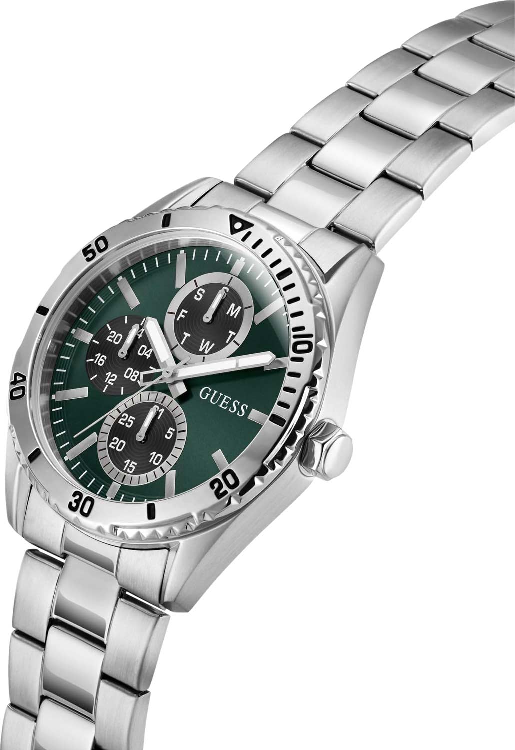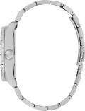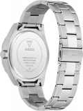 Заостренные прямоугольные стрелки в стиле Baton с люминесцентным покрытием, которое светится в темноте. Время в 24-х часовом формате, дата и день недели вынесены на отдельные циферблаты. Граненая заводная головка с защитой. Браслет с раскладывающейся застежкой.